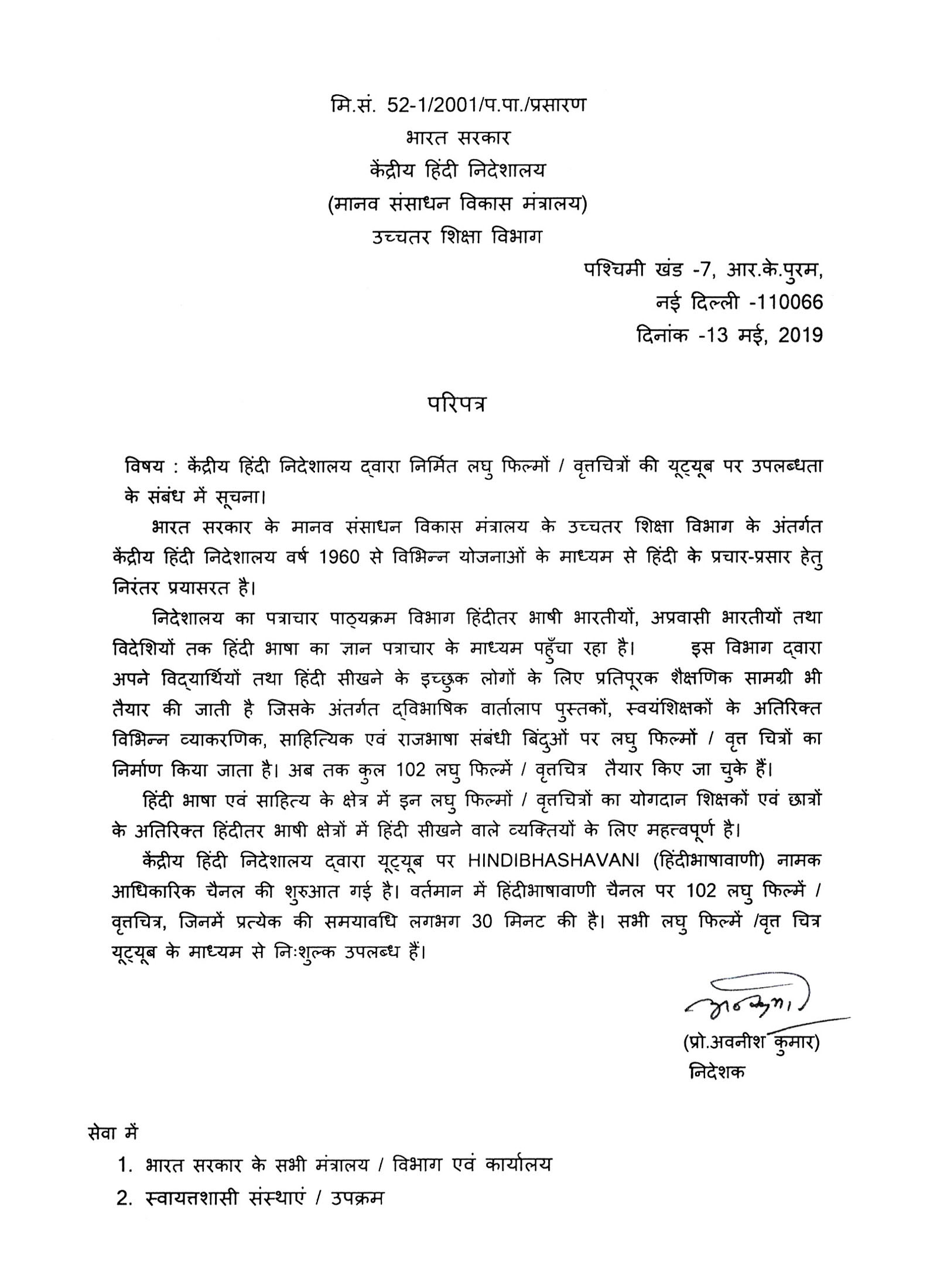 केंद्रीय हिंदी निदेशालय द्वारा निर्मित लघु फिल्मों / वित्तचित्रों की यूट्यूब पर उपलब्धता के संबंध में सूचना।