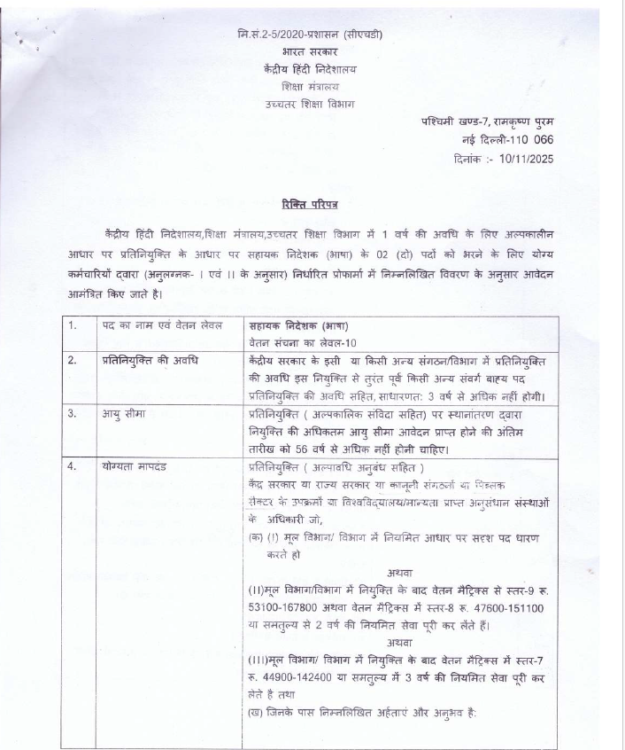 प्रतिनियुक्ति के आधार पर सहायक निदेशक(भाषा) के पद को भरना